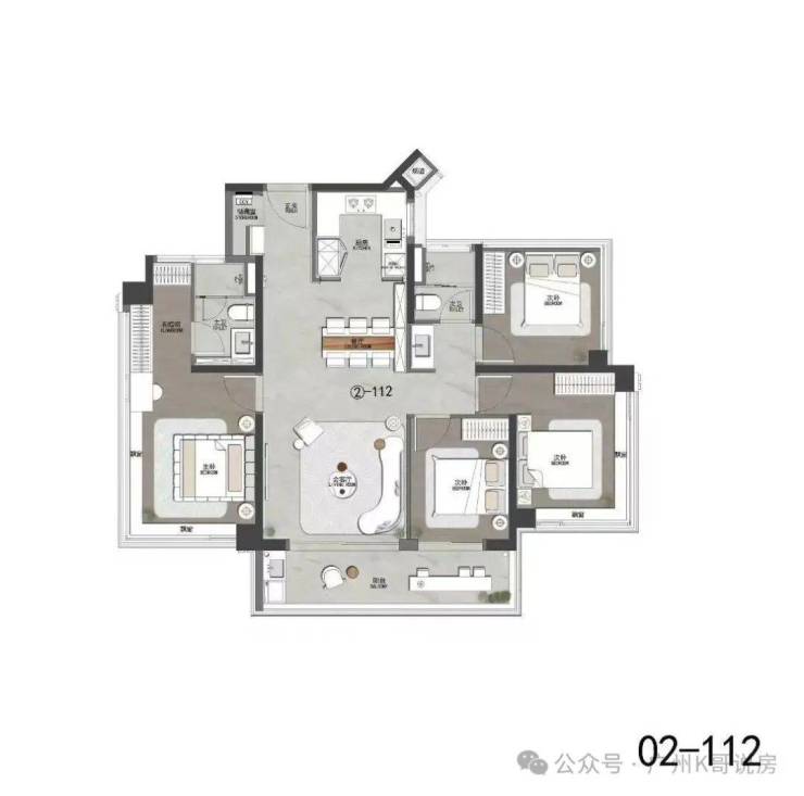 建面约105平户型,四开间构筑约12.8米南向面宽,带来超强通风、全明采光。