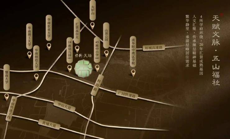 项目位于天河五山汇景新城板块内,珠江新城和琶洲金融城两中轴间的核心位置,楼盘身后就是汇景20年醇熟的圈层配套