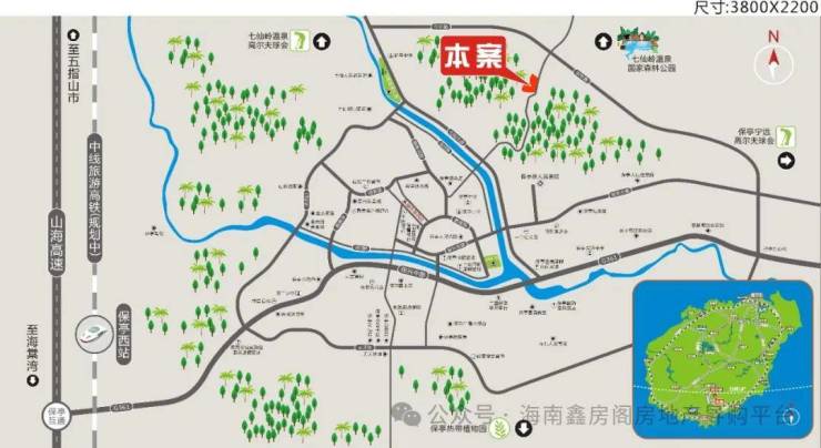 项目位于保亭东环路以南,七仙大道以北,东临029乡道,项目与海棠湾区距离33公里仅需20分钟车程,便可享受“国家海岸”海棠湾的顶级配套,有301医院、会展中心、国家免税城、高尔夫球场、海洋公园、五至七星级国际酒店带,全方位提升了保亭的区位优势及配套优势,项目距离三亚机场也仅需50分钟车程,最大程度的方便了与三亚的衔接,项目北距五指山市39公里,40分钟的车程;东距陵水40公里,约45分钟车程,另外中线高铁计划2023年开工,起于海口站,向南途经定安-屯昌-琼中-五指山-保亭-止于三亚站,形成了无缝的山海互动与蓝海相接。