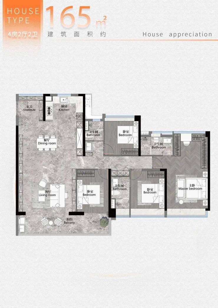 :全屋南北对流,南向面宽约 15.65 米(媲美侨鑫汇悦台 236㎡大平层);南向阳台长 8.65 米(可部分并入次卧);最小次卧进深 3.65 米(三边下床无压力),主卧开间 4.3 米(比不少改善盘客厅还大)。