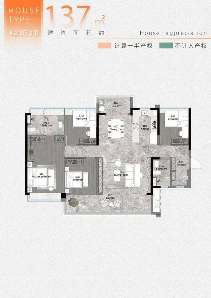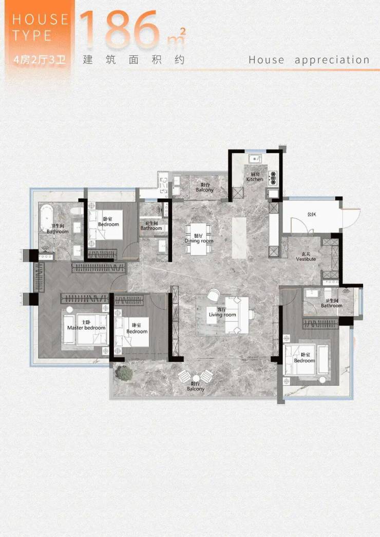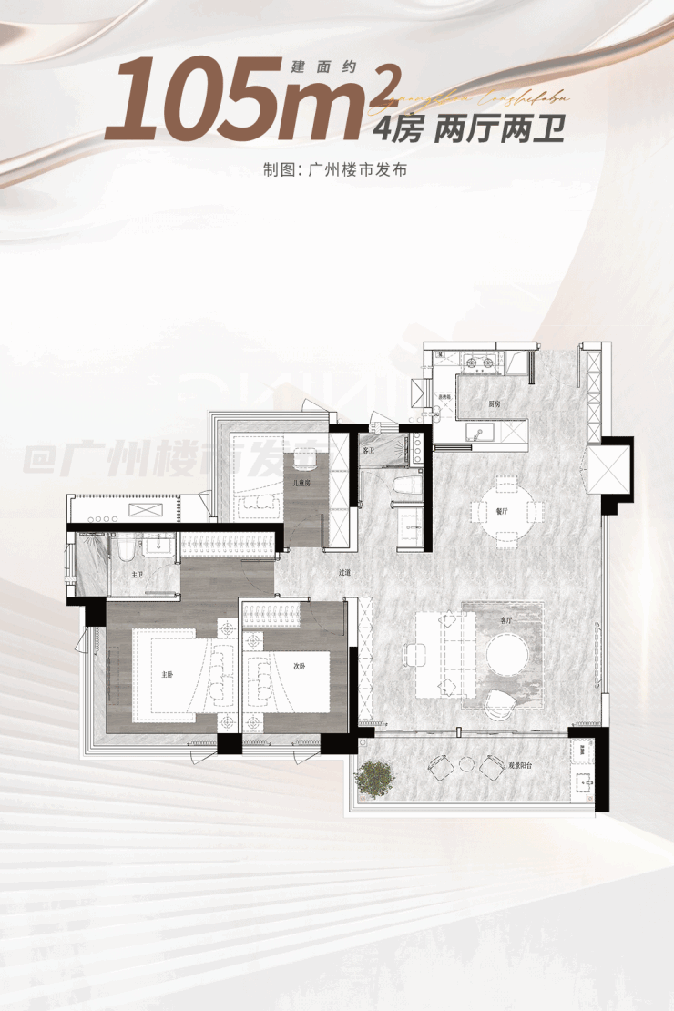 建面约105平户型,餐厅的宽度升级到了约4.3米,客厅开间最大可做到约6.1米!整个餐客厅的面积就超30平,媲美市面上约150平+户型的客厅尺寸。