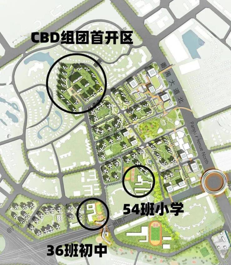 进度最快的是 CBD 组团内的 54 班小学(里仁洞小学改扩建)、36 班初中(新建),已官宣引入番广实验教育集团(广大附中番禺实验学校管理),与越秀大学城和樾府配建学校同源。
