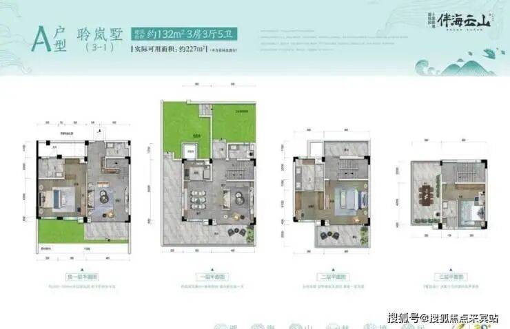 聆岚墅A户型:建筑面积约132㎡,实际可用面积约227㎡(不计花园及露台)