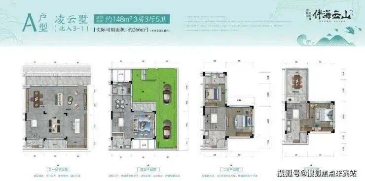 凌云墅A户型(北入户)建筑面积约148㎡,实际可用面积约266㎡(不计花园及露台)