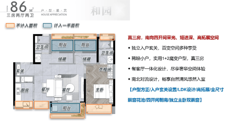 86方,开间朝南独立玄关入户+可灵活调节空间提高实用率形成灵活收纳空间,达成精细化收纳模式实用率超95%,带衣帽间的主卧套间+270°全景阳台一房之内纵览全景,南北对流对流的设计,采光通风不忧愁。