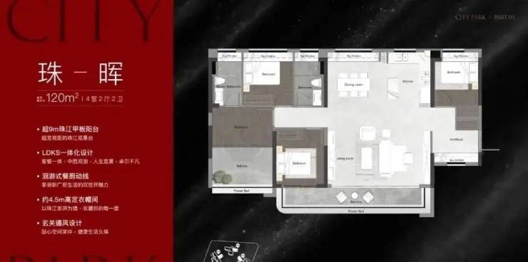 16-25F的层数,约120平-140平四房产品,基本比较复合改善一族的需求。这个大多数都能做到,亮眼的地方是宽阔阳台的设置等,刚好可以迎合观江景的诉求吧。