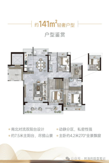 约 141㎡——4房2卫,均价约 3-3.5万/㎡;总价425-495万,南北通透双阳台