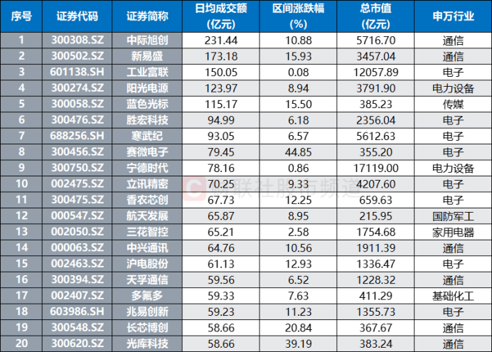 具体个股来看,本周累计共有130股日均成交额在20亿元以上,略少于上周水平(139股)。其中,中际旭创、新易盛、工业富联、阳光电源、蓝色光标5股获最近重点关注,日均成交额分别达231.44亿元、173.18亿元、150.05亿元、115.17亿元。同时,胜宏科技、寒武纪、赛微电子、宁德时代、立讯精密、香农芯创、航天发展等股周内成交额数据也居前。