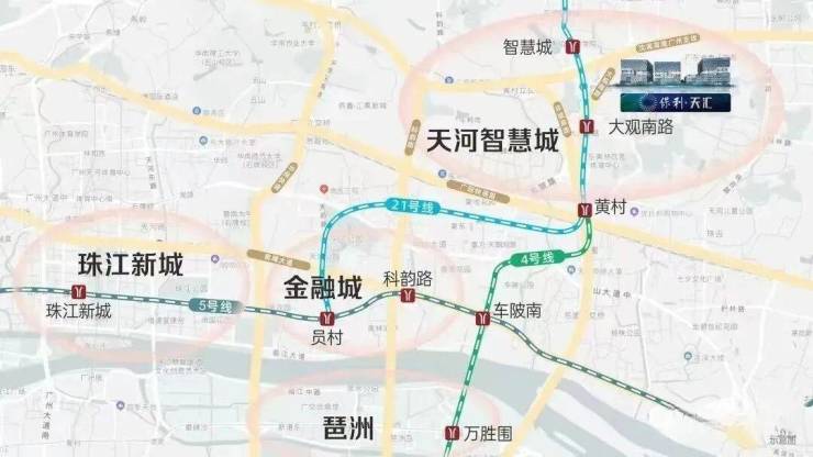 项目交通网络较为发达。距离地铁 21 号线大观南路站约 1.5 公里(部分优势分析提及 1.2 公里,综合表述),虽步行距离稍远,但通过地铁 1 站可换乘 4 号线,直达金融城、琶洲等重要商务区域;4 站到员村换乘 5 号线,能够直抵珠江新城,对于在核心区域通勤的上班族来说较为便利。距离最近公交站大观中路南站约 500 米,多条公交线路经过,方便业主日常出行。自驾出行方面,周边有大观路、沈海高速、广深高速、广园快线、环城高速以及在建的机场第二高速等主干道,40 分钟内可覆盖广州核心区域,无论是市内出行还是长途旅行都十分便捷。