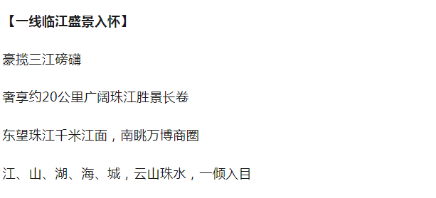 ——区位特点:地处海上丝绸之路的源点,北望万亩果林、CBD双塔、远眺白云山,南面与广州星河湾隔江相望,东北面与大学城及黄埔古港相毗邻,东、南、北三面均为宽阔的珠江,江面最宽处达到1200米,是广州规划的城市中心“中央居住区”所在,也是广州独享三重景观的住宅。
