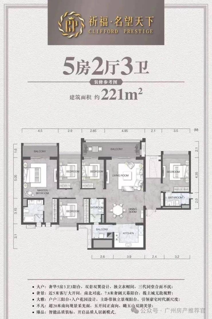 三口之家或者二孩家庭可以重点考虑 105 平或者 120 平三房两卫,三代同堂 221㎡至佳。楼宇分布采用风车型布局,最大限度扩大了景观面和私密度,如此全景豪宅在广州少之又少!