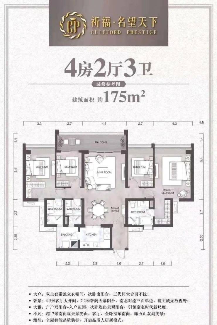 175 平四房双主套设计,带入户花园,全部卧室均为东南向,客厅开间达 4.5 米,景观阳台长达 7.2 米,两个主卧分布在客厅两翼,满足三代同堂居住的同时,又考虑到老人家与年轻人生活作息的差异,可以做到互不干扰,相互拥有独立的居住空间。