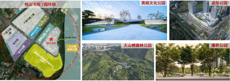 包括文化公园、音乐公园、康养公园(建设中)、全民健身活动中心(规划中)、体育公园、大山乸森林公园、南湾公园,共同营造自然、人文、宜居生态的现代东方书院式人居环境。