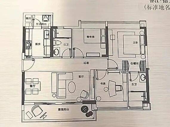 户型中有两个房间是全景飘窗,观看景观无死角,主人房还有衣帽间和独立卫生间。唯一不足的是公卫正对客厅位置,私密性略微不足。