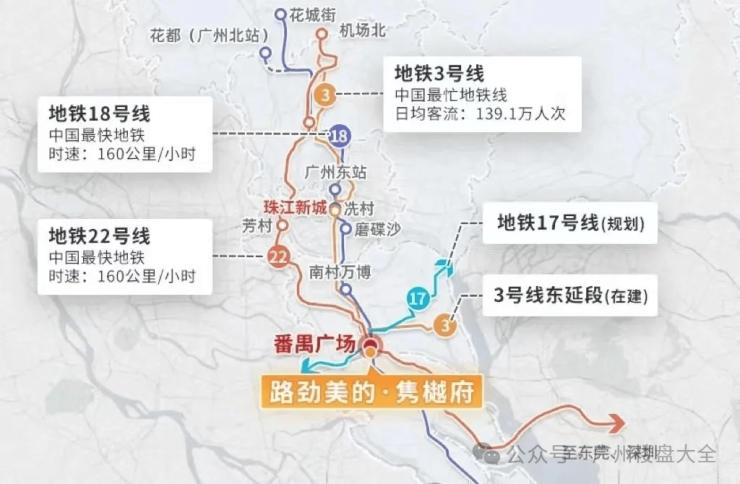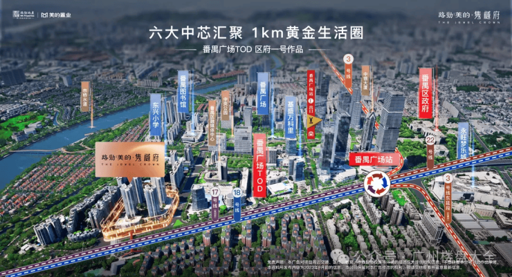 1、交通:项目距离最近的地铁站3号线番禺广场站约800-900米左右,在这里有4条地铁交汇,分别为18-22-3号线,还有规划中的17号线,去珠江新城、琶洲都是直达过去