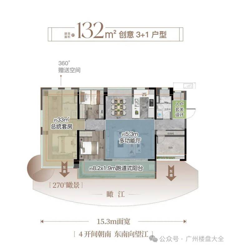 132户型亮点:约8.2*1.9m 跑道式阳台,赏景休闲两相宜,南望江北瞰园,享IMAX无遮挡视野,生活“嵌入”风景,尊荣入户玄关,5.3m奢阔复合厅,格局通透,气度超然,约33㎡总统级套房大主卧,奢配270°瞰景大飘窗。