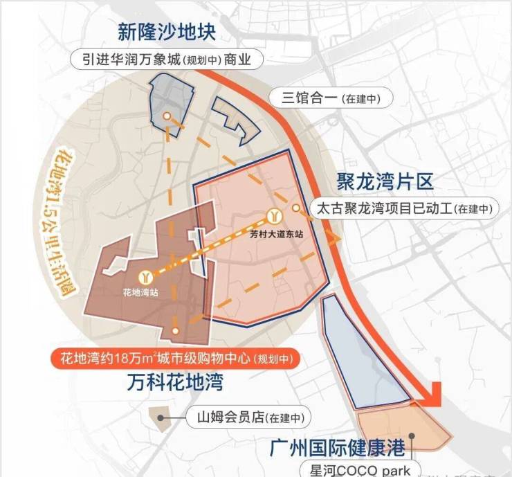 此外花地湾片区基本都是由万科统一开发,汇合白鹅潭-花地湾-聚龙组团的板块张力,白鹅潭核心区、聚龙组团、花地湾组团,于半径约2KM内构建珠江西岸CAZ黄金三极。