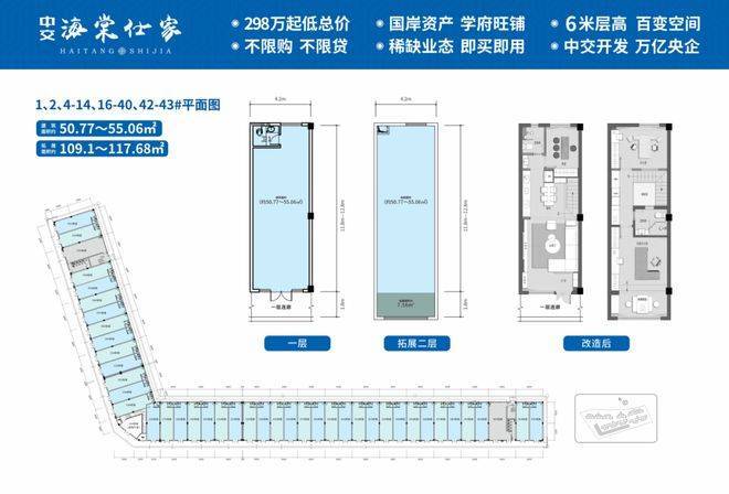 建筑面积约50-480㎡,享11.8-12.8m高功能型进深,4.2-8.4m敞阔开间,首层6m性价比大挑高,后期可改造商墅。