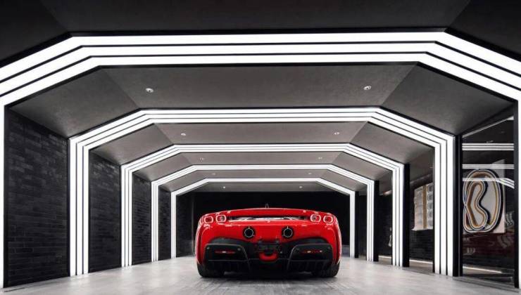 以007银幕形象为创意原点设计,汲取自蒙特卡洛F1赛车道,超宽4车位全尺寸,深色石材,搭配金属与炫酷回旋交叠灯,低调神秘,又充满现代科技智慧。