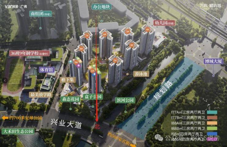 项目首推北组团1、9栋,也是最靠近兴业大道的两栋,首推面积从77、88、98、105平,后期还有更大的135平,产品设计使用率高达127-137%。