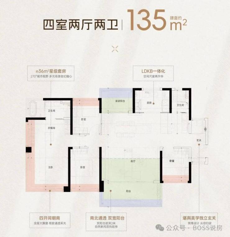 135㎡户型:南北对流双阳台,三代同堂无忧