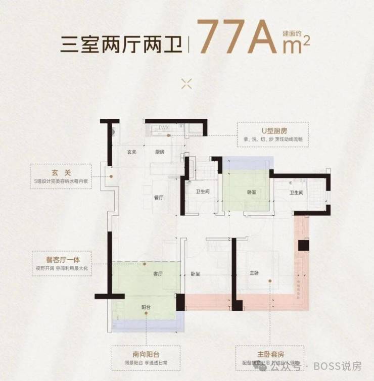 77㎡户型:次卧与客厅灵活可变,适合单身或新婚夫妻全周期需求