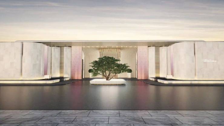 主入口是约55米宽、约8.7米挑高的酒店式大门,再以各种奢石铺陈;