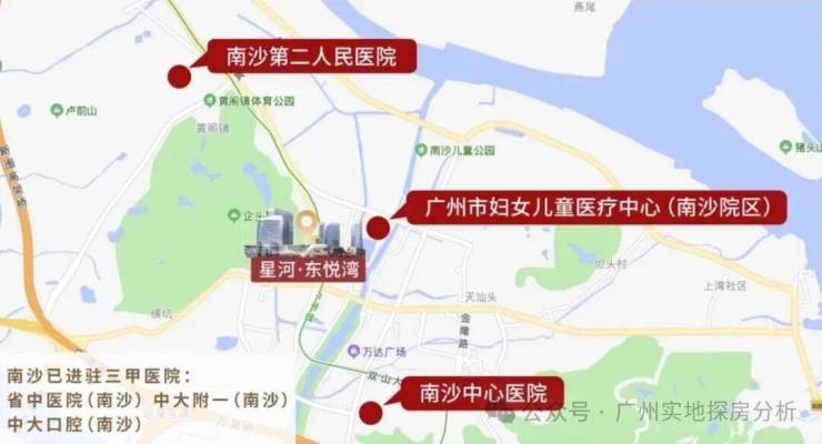 距项目约200米即广州市妇女儿童医疗中心南沙中心医院、中山附属六院、南沙妇幼医院、金州门诊,广州市第一人名医院南沙医院。