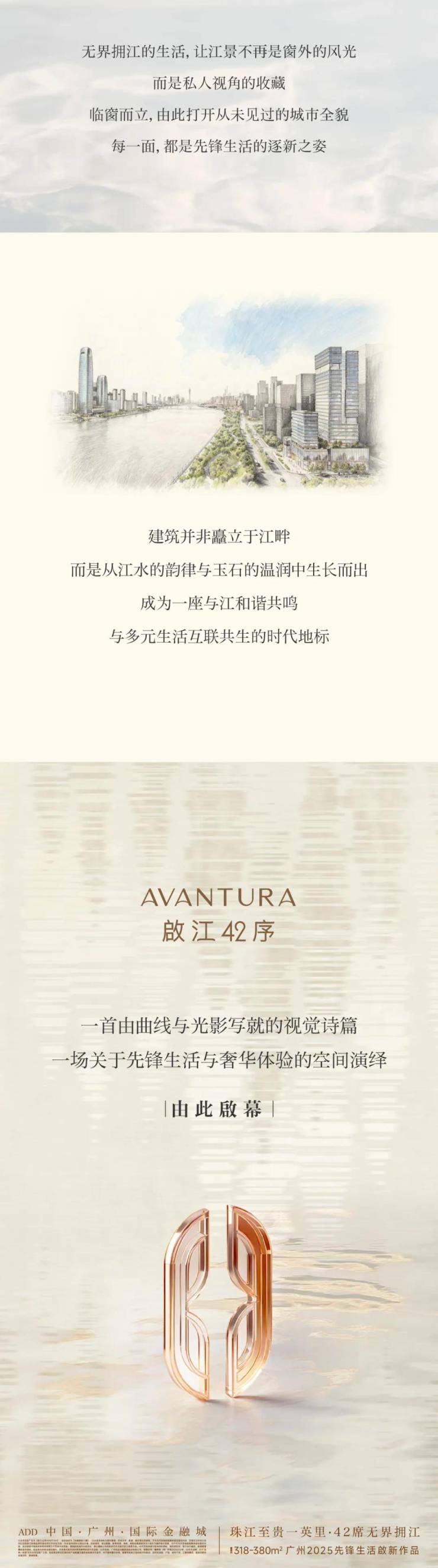 核心理念: 位于广州“珠江至贵一英里”的黄金岸线,定位为全球先锋生活方式的塔尖藏品,仅推出42席稀缺豪宅。