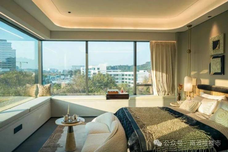 主卧套房更以约 270 度 IMAX 级环幕视野,将连绵山色与城市繁华尽收眼底,清晨看云雾缭绕山间,入夜赏灯火璀璨夜景。每一扇窗都是取景框,每一处角落都浸润着自然的诗意,重新诠释高端人居与山水共生的理想境界。