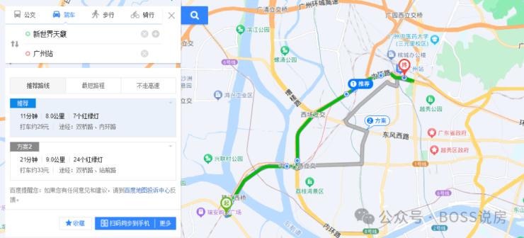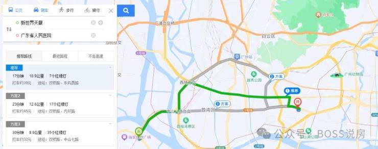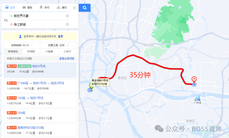 测评中重点测评了从小区出发到越秀和天河两地的通勤时间;