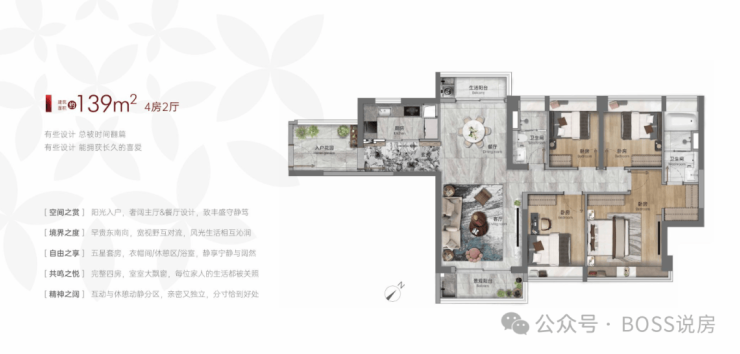 楼栋采用半围合式布局,呈 45 度 “风车” 状阵列排列,这种设计将南向采光最大化分布于楼栋之中,实现 “风光同权”,还能让不同面积段产品都能享受到开阔江景或静谧园景,做到 “风景平权”。