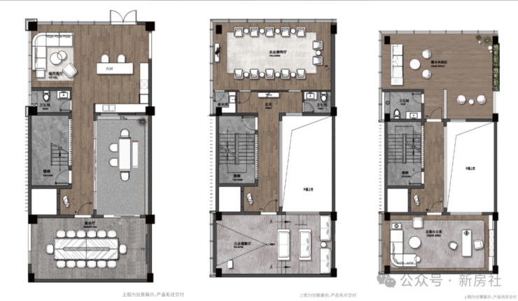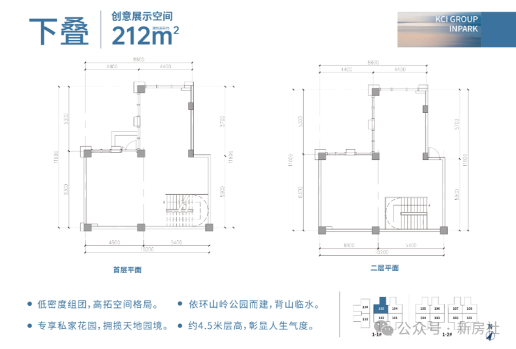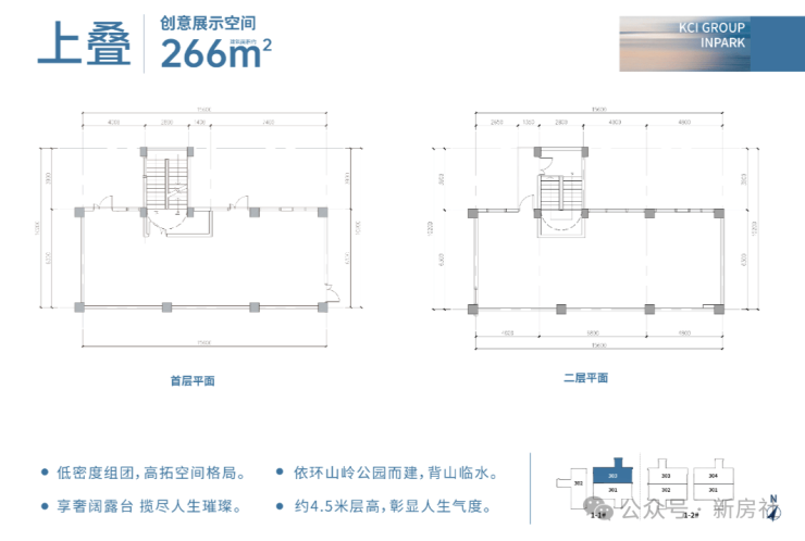 5.提供多种户型的复式设计,层高约4.5米,空间利用率高,适合企业总部、创意工作室、私房菜馆等多元用途,部分产品还配备私家花园、露台等特色空间,满足个性化需求。