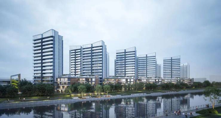 户型排布从石榴岗河自东向西依次升高,保证了约300米宽的生态水景面。