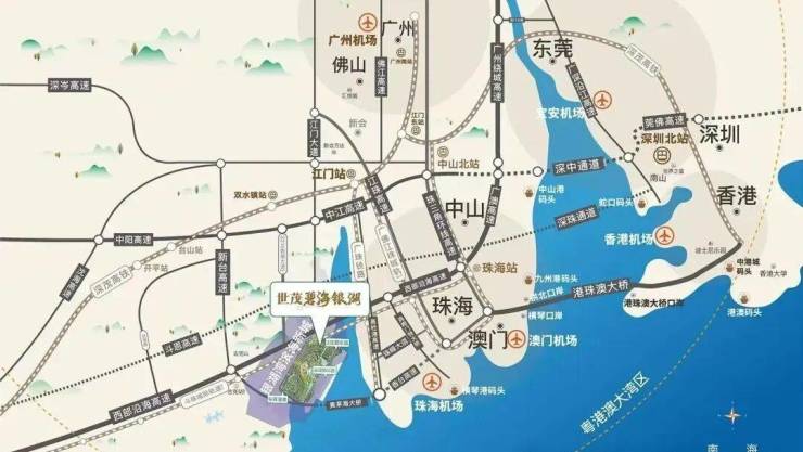 緊密連接港珠澳大橋、深中通道與廣佛都市圈北通道,緊鄰灣區第三大高鐵站江門站,享受黃茅海開通利好,速达港澳直通江门,輻射灣區五大機場,海運直達香港市中心,實現與周邊城市群快速互通。