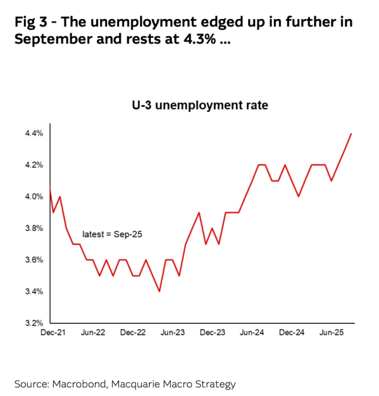 麦格理提供的图表显示,美国失业率正呈上升趋势: