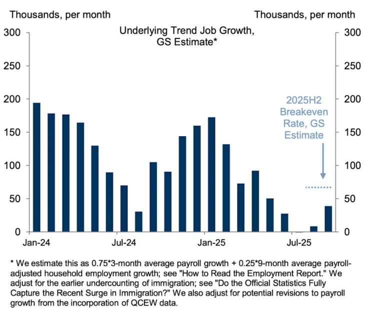 高盛估计,当前美国就业岗位新增数量已低于维持就业市场平衡所需的 “盈亏平衡” 水平。