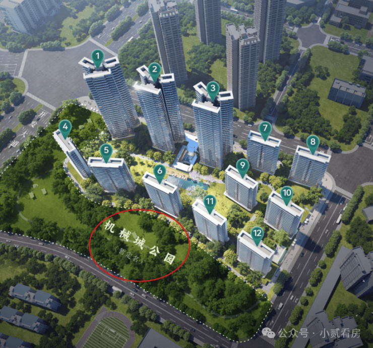 4,以公园隔绝工业地块干扰,项目位处公园腹地内,项目西南两侧均为绿地,景观资源尚可