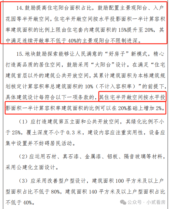 住宅半开敞空间按水平投影面积一半计容建面的比例上限由住宅套内建筑面积的15%提升至 20%,满足连续开敞率不低于40%的主景观阳台不限制进深。
