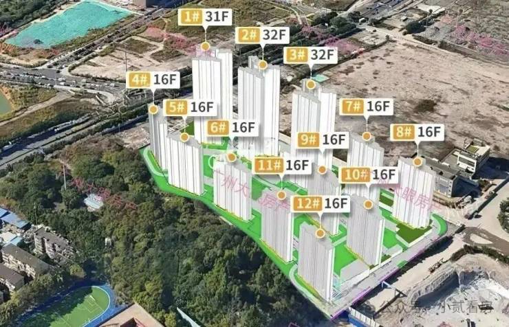 项目规划了12栋楼,其中有3栋31-32层的高层住宅,2T4,约368套货量;9栋16层高的小高层,2T2,约288套货量。