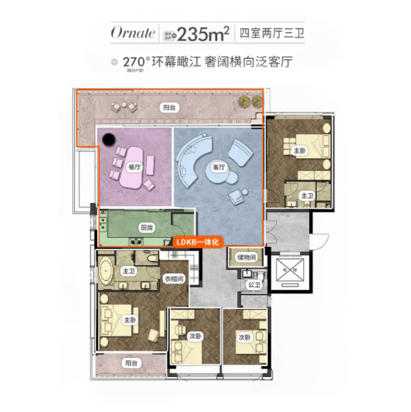双主卧套间布局保障隐私,LDKB一体化格局让公共空间更开阔