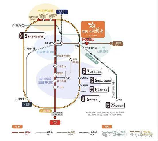 项目位于地铁14号线钟落潭站旁,距离大概1000米,5站到嘉禾望岗,换乘2、3号线可直通白云新城和畅达广州全城;