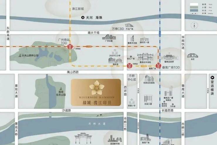 交通方面,距离市桥地铁站较远,需要开车过去,通过地铁快速通达番禺广场及珠江新城CBD。自驾车有禺山西路,可以接驳东新高速和番禺大道。