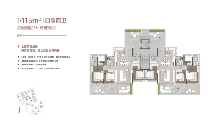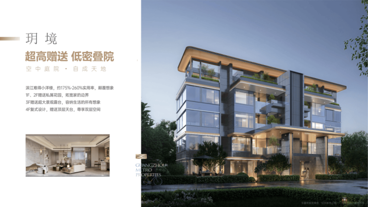 “玥境”为滨江小洋楼,主打112-124㎡低密叠院,最大亮点是超高赠送率,1F、2F户型赠送私属花园,3F赠送超大景观露台,4F复式设计,赠送顶层天台。