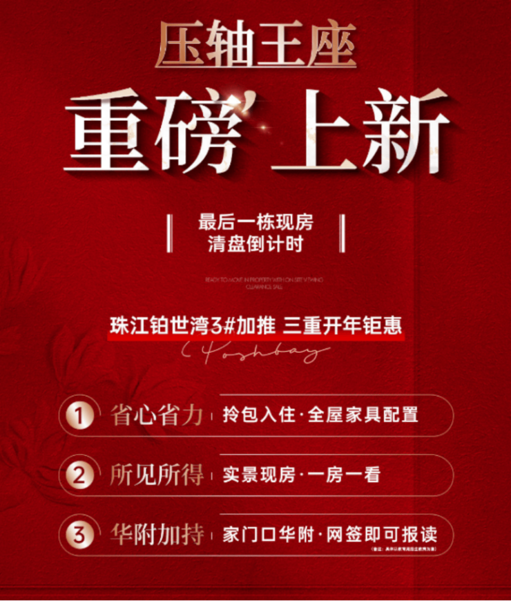 万博珠江城铂世湾3#为A2组团压轴上新,是整个项目最后一栋现房房源,清盘倒计时的节点,意味着错过再无。项目为实景现房,支持“一房一看”,购房者可实地查验户型、园林、楼栋格局,规避期房烂尾、延期、货不对板的风险。