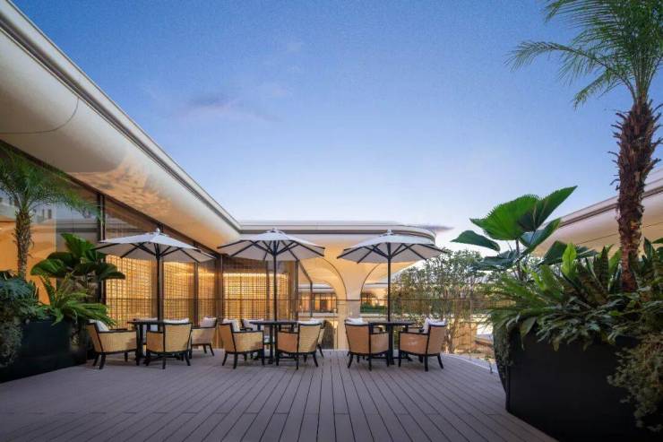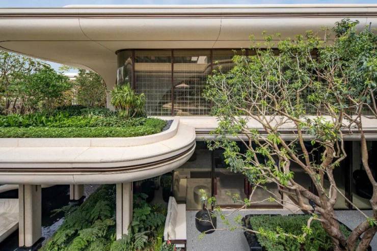 立体,带来了更丰富的场景浓度。从水中生长出来的树冠拱廊,把地面花园与二楼的空中花园交织在一起。