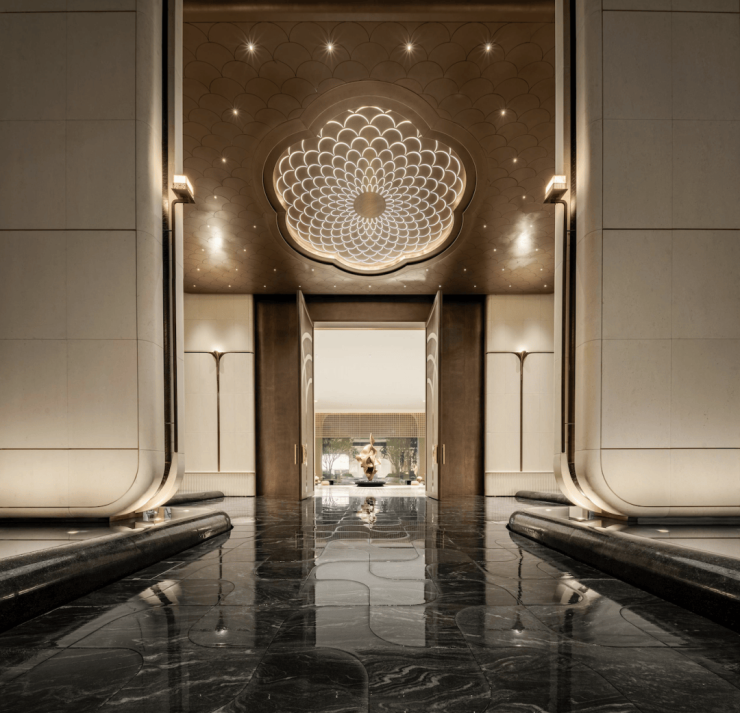 庭院中心巨型水池玉盘由伯爵白大理石雕琢,通体皇家白玉奢石华盖星灯如“明月映玉盘”。既是对岭南“天人合一”居住哲学的当代诠释,也成为业主放松身心的能量场。