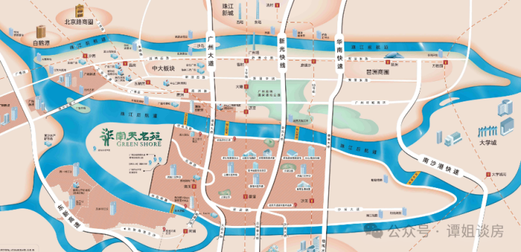 1、项目地处的洛溪岛,是继二沙岛之后,市中心第二个中轴岛,三江汇聚,处于城市中轴与珠江后航道的交汇处;