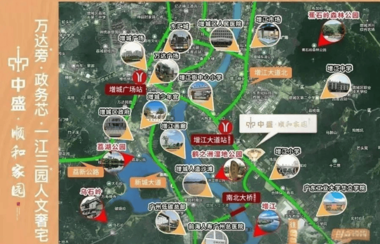 中盛顺和家园位居广州市增城区增江街象山社区广汕公路旁,地处粤港澳大湾区核心区域,广深两大城市圈层之间,环珠江口100公里“黄金内湾”的北部端点,广深港、广珠澳科创走廊重要节点,连接黄埔海丝国际合作先行区,与大湾区重要枢纽东莞隔江相望。