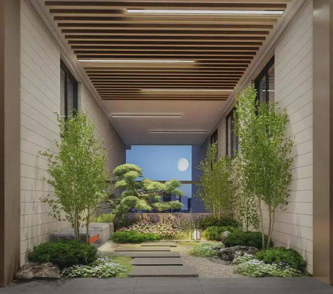 从人与环境的和谐交融的理念出发,打造立体架空花园,周围绿植环绕,漂浮上空的森林天境,满足中国人亲近自然居住的特殊情结。
